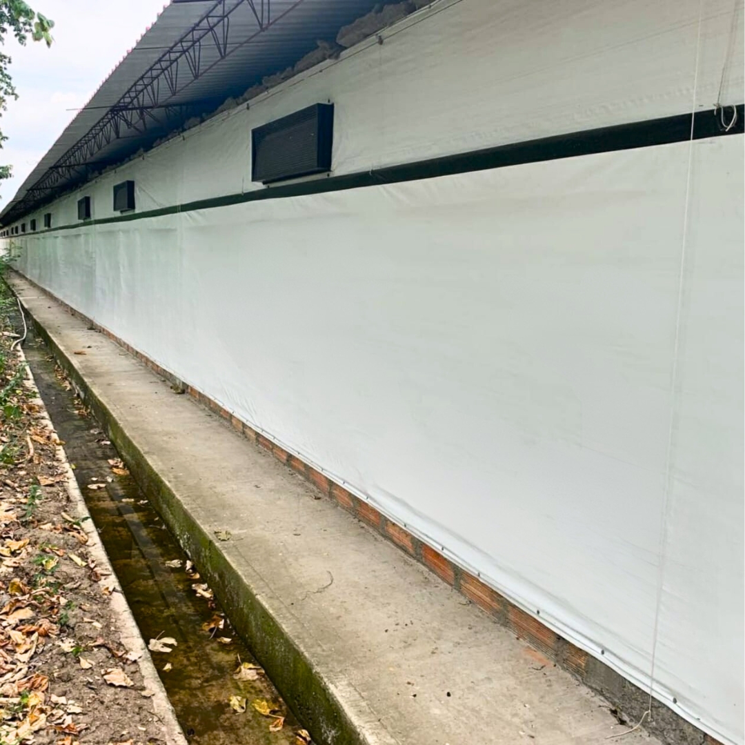 Fully opaque, high-performance coated fabric engineered specifically for poultry and livestock curtain systems. Its dual-color construction—white on the exterior and black on the interior—provides exceptional light-blocking capability, ensuring precise illumination control inside barns and production environments. This ensures optimal environmental conditions for poultry, swine, and other livestock operations.